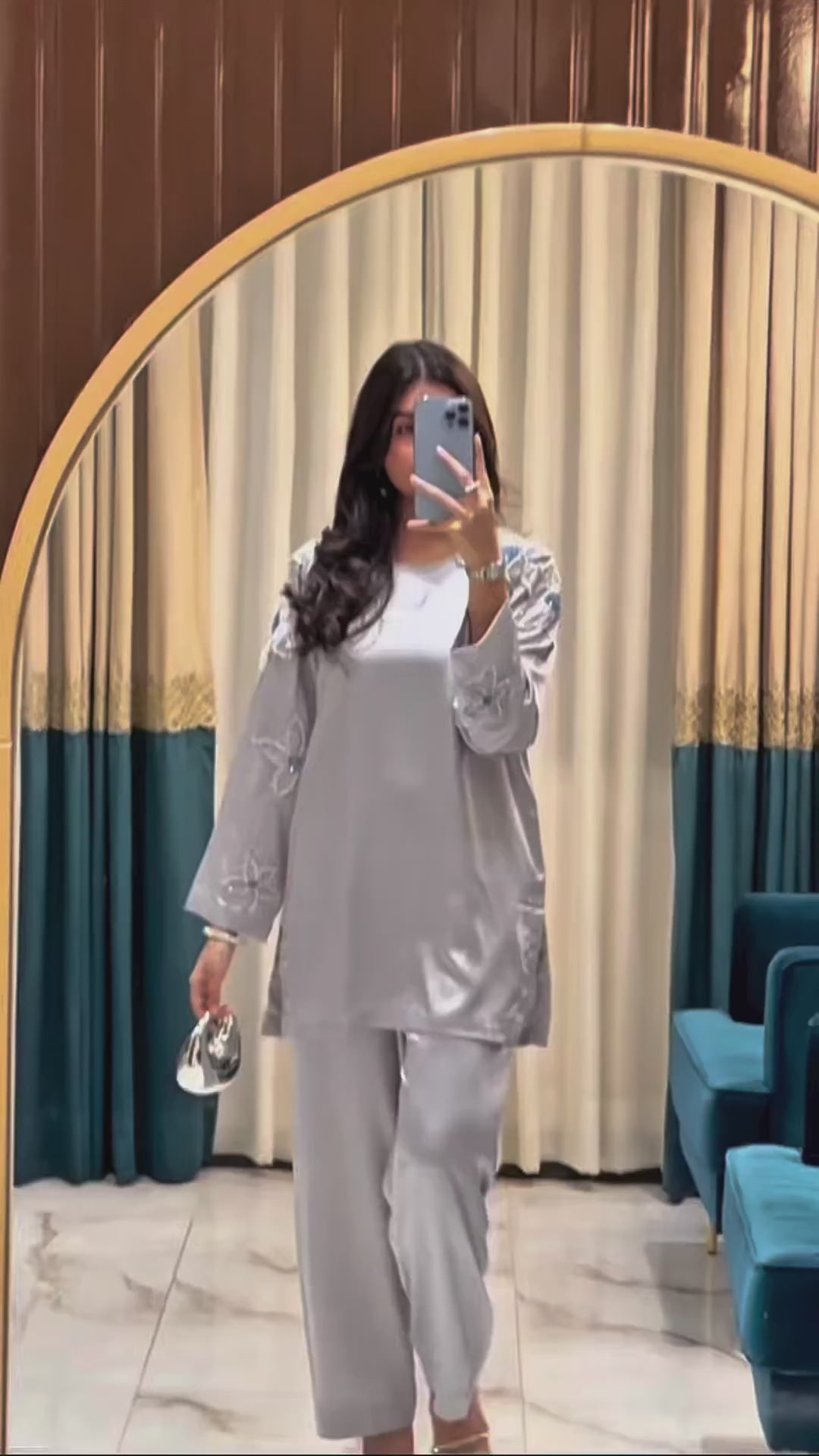 A refined 2-piece in soft grey silk, adorned with beautifully embroidered florals, understated, elegant, and effortlessly festive.